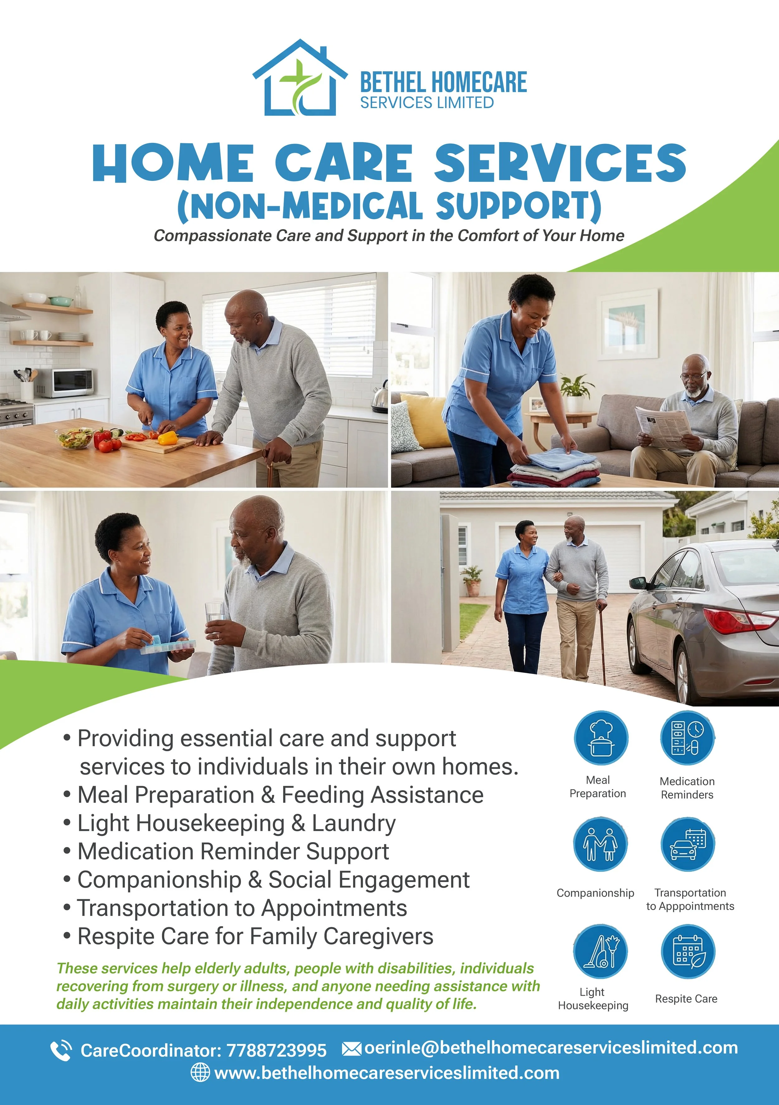* Nutrition & Household Stability: Professional meal preparation, feeding assistance, and light housekeeping to ensure a safe, sanitary, and healthy living environment.